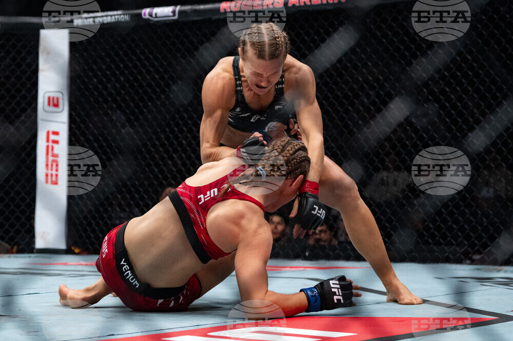 Stephanie Luciano, left, and Ravena Oliveira, right, fight during their women's strawweight mixed martial arts bout at a UFC Fight Night in Vancouver, British Columbia, Saturday, Oct. 18, 2025. (Ethan Cairns/The Canadian Press via AP)