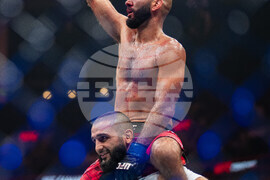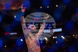 Aiemann Zahabi celebrates after defeating Marlon Vera in a bantamweight mixed martial arts bout at a UFC Fight Night in Vancouver, British Columbia, Saturday, Oct. 18, 2025. (Ethan Cairns/The Canadian Press via AP)