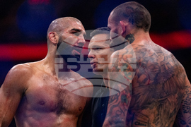 Aiemann Zahabi, left, and Marlon Vera, right, prepare to fight in a bantamweight mixed martial arts bout at a UFC Fight Night in Vancouver, British Columbia, Saturday, Oct. 18, 2025. (Ethan Cairns/The Canadian Press via AP)