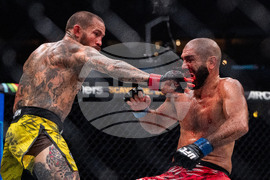 Kyle Prepolec, of Canada, right, lands a punch to Drew Dober's face during their lightweight bout at a UFC Fight Night in Vancouver, on Saturday, Oct. 18, 2025. (Ethan Cairns/The Canadian Press via AP)