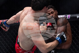 Kyle Nelson, left, of Canada, and Matt Frevola, right, fight during a lightweight mixed martial arts bout at a UFC Fight Night in Vancouver, British Columbia, Saturday, Oct. 18, 2025. (Ethan Cairns/The Canadian Press via AP)