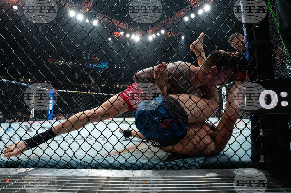 Bruno Silva, back, chokes Hyun-Sung Park, of South Korea during their flyweight bout at a UFC Fight Night in Vancouver, British Columbia, Saturday, Oct. 18, 2025. (Ethan Cairns/The Canadian Press via AP)