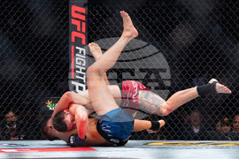 Melissa Croden, top, and Tainara Lisboa, bottom, fight during a women's bantamweight bout at a UFC Fight Night mixed martial arts bout in Vancouver, British Columbia, Saturday, Oct. 18, 2025. (Ethan Cairns/The Canadian Press via AP)
