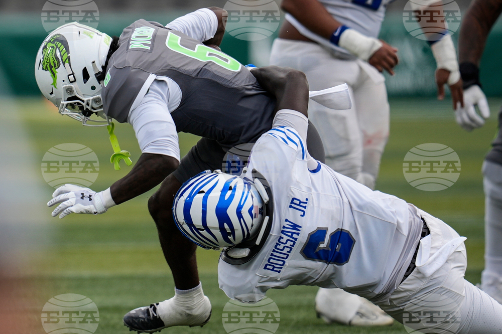 UAB wide receiver Brandon Hawkins Jr. (6) runs against Memphis linebacker Everett Roussaw Jr. (6) during the first half of an NCAA college football game, Saturday, Oct. 18, 2025, in Birmingham, Ala. (AP Photo/Mike Stewart)