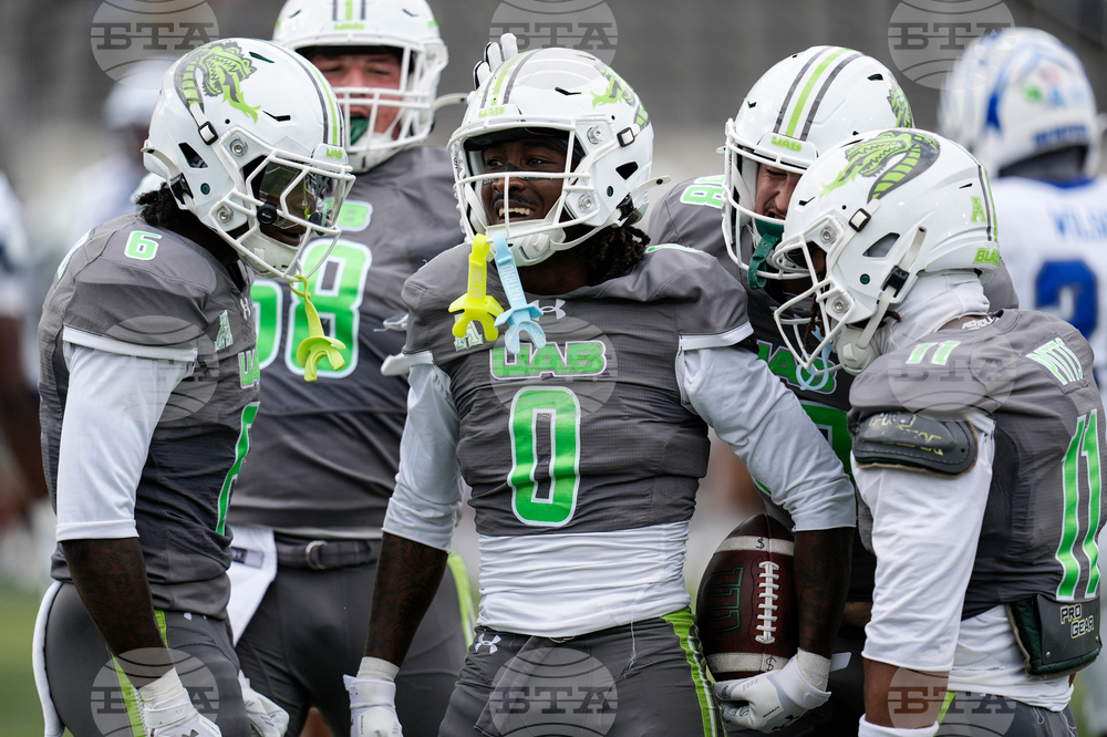 UAB defensive back Pierre Royster (7) celebrates his interception against Memphis during the second half of an NCAA college football game, Saturday, Oct. 18, 2025, in Birmingham, Ala. (AP Photo/Mike Stewart)
