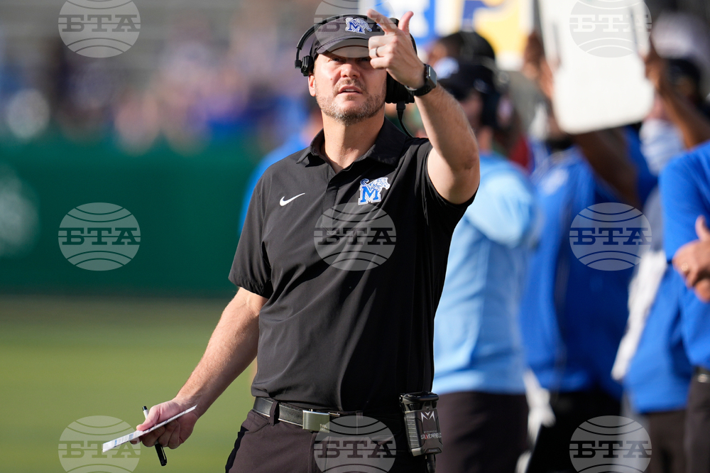 Memphis head coach Ryan Silverfield walks the sidelines during the first half of an NCAA college football game against UAB, Saturday, Oct. 18, 2025, in Birmingham, Ala. (AP Photo/Mike Stewart)