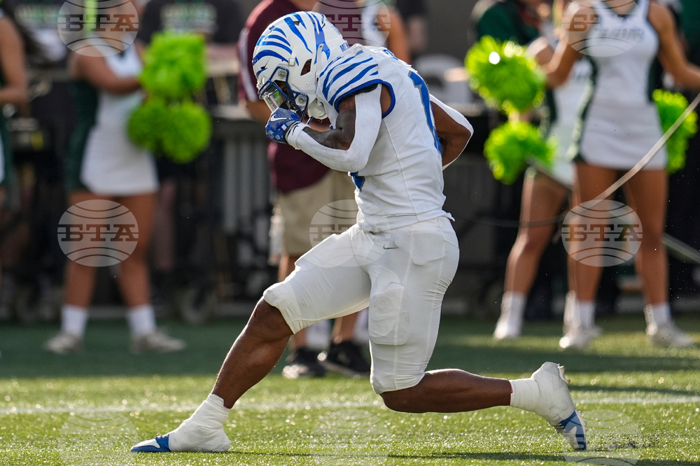 Memphis' Greg Desrosiers Jr. (13) and Evan Bishop celebrate Desrosiers' touchdown during the first half of an NCAA college football game against UAB, Saturday, Oct. 18, 2025, in Birmingham, Ala. (AP Photo/Mike Stewart)