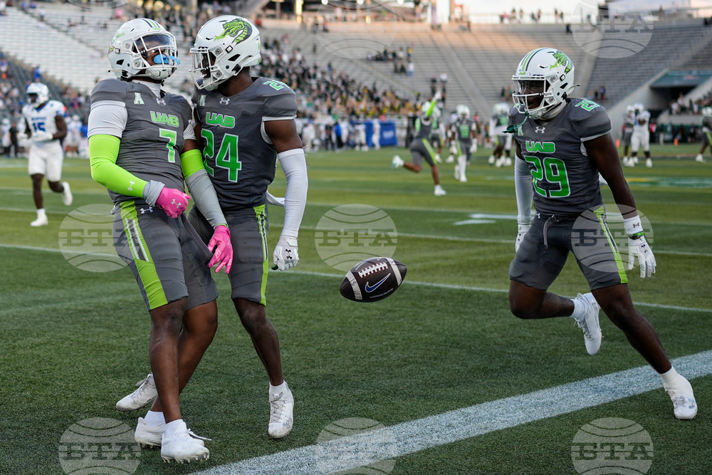UAB running back Solomon Beebe (11) runs against Memphis during the first half of an NCAA college football game, Saturday, Oct. 18, 2025, in Birmingham, Ala. (AP Photo/Mike Stewart)