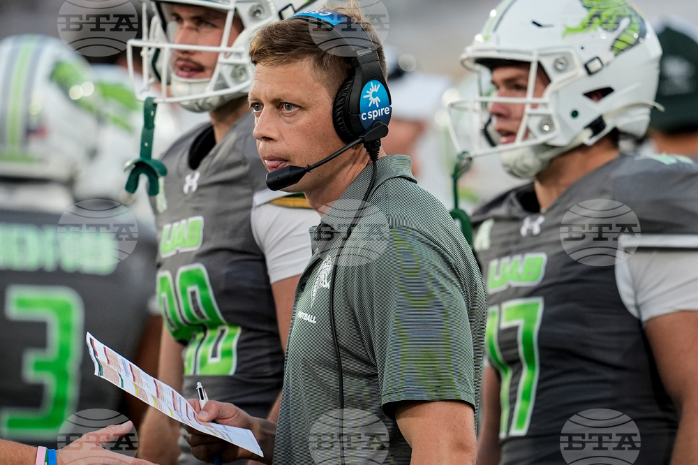 UAB interim head coach Alex Mortensen walks the sidelines during the second half of an NCAA college football game against Memphis, Saturday, Oct. 18, 2025, in Birmingham, Ala. (AP Photo/Mike Stewart)