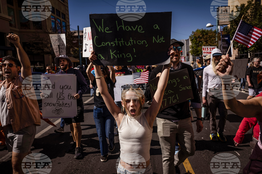 Daniella Diener participates with other protesters in the "No Kings" rally and march in downtown Albuquerque, N.M., on Saturday, Oct. 18, 2025. (Chancey Bush/The Albuquerque Journal via AP)