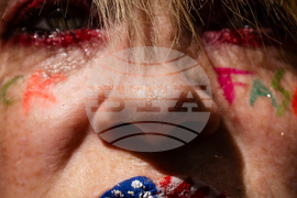 Sarah Elizabeth Taylor wears paint depicting a U.S. flag on her lips while participating in the "No Kings" rally and march in downtown Albuquerque, N.M., on Saturday, Oct. 18, 2025. (Chancey Bush/The Albuquerque Journal via AP)