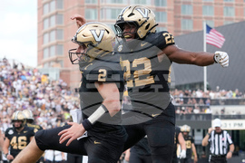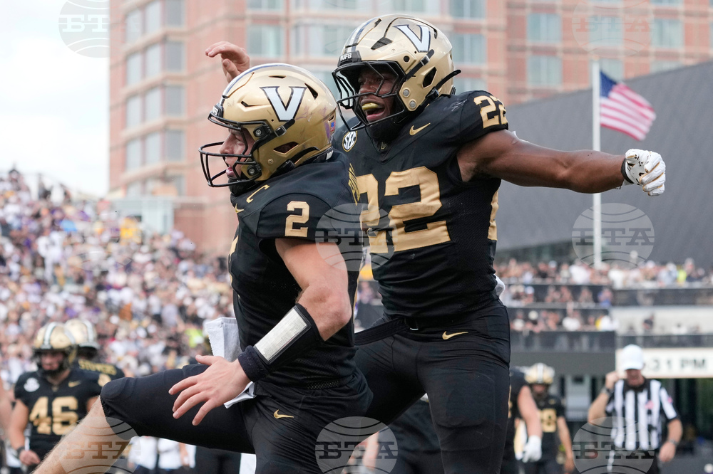 Vanderbilt quarterback Diego Pavia (2) celebrates his touchdown with running back Makhilyn Young (22) during the second half of an NCAA college football game against LSU, Saturday, Oct. 18, 2025, in Nashville, Tenn. (AP Photo/George Walker IV)