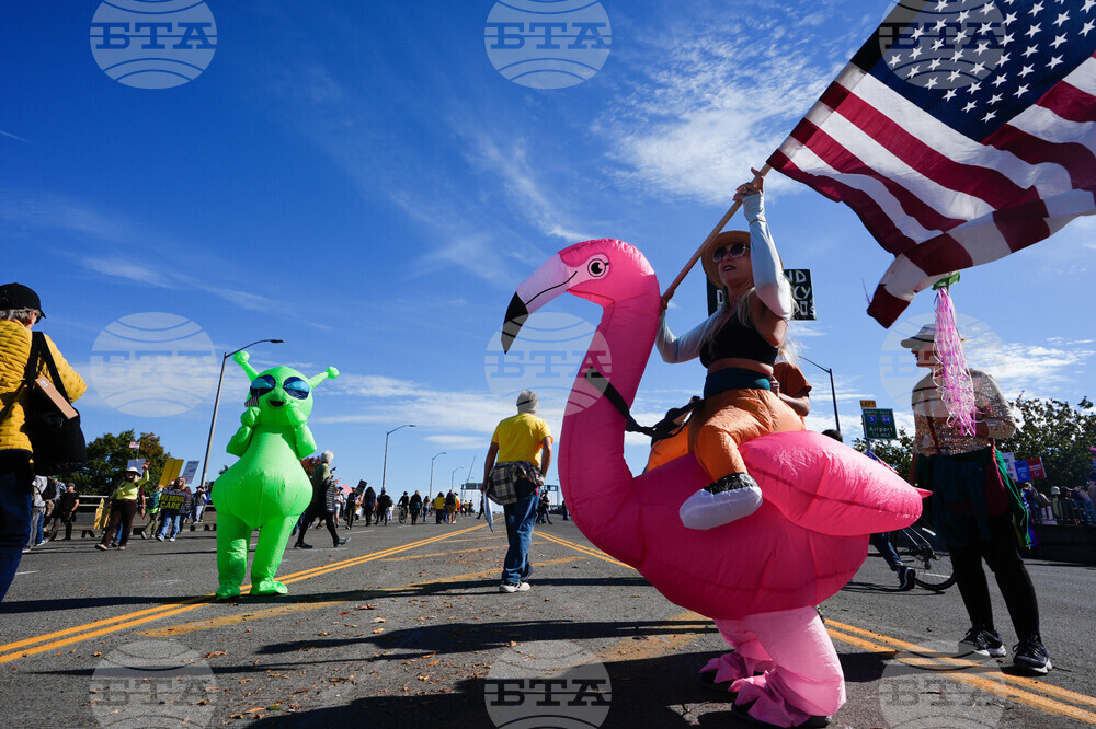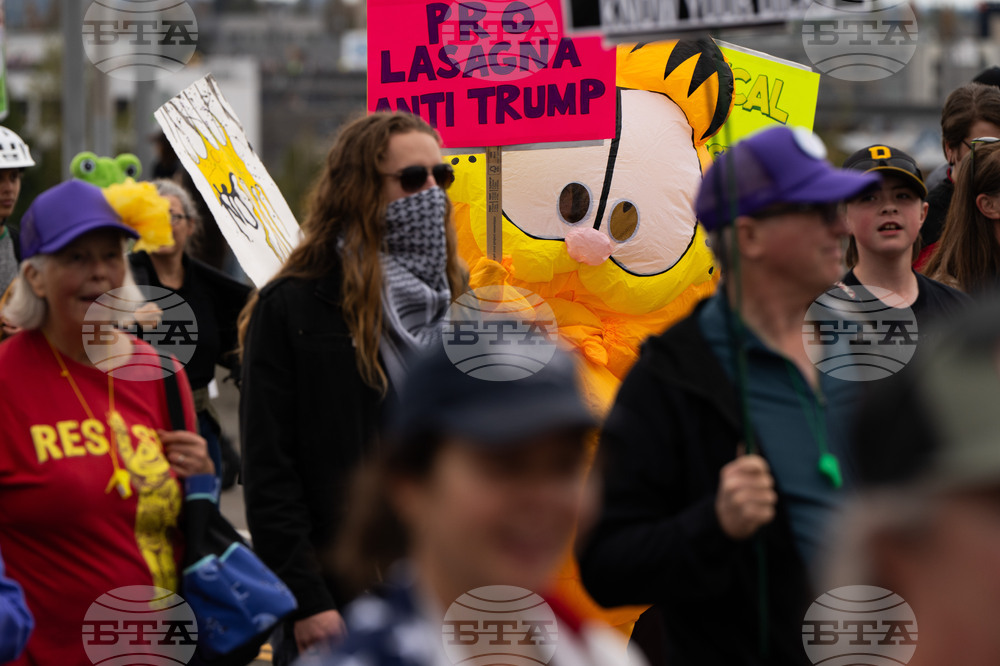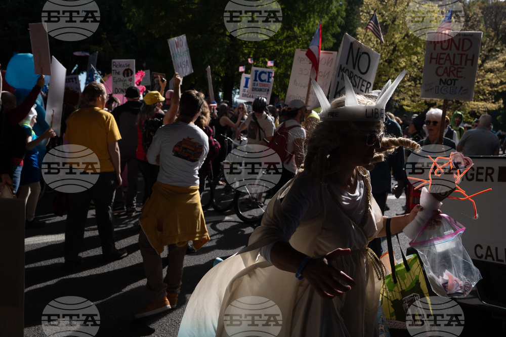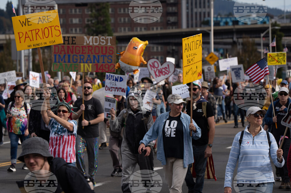 People march during a "No Kings" protest in Portland, Ore., on Saturday, Oct. 18, 2025. (AP Photo/Jenny Kane)