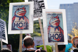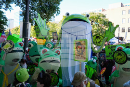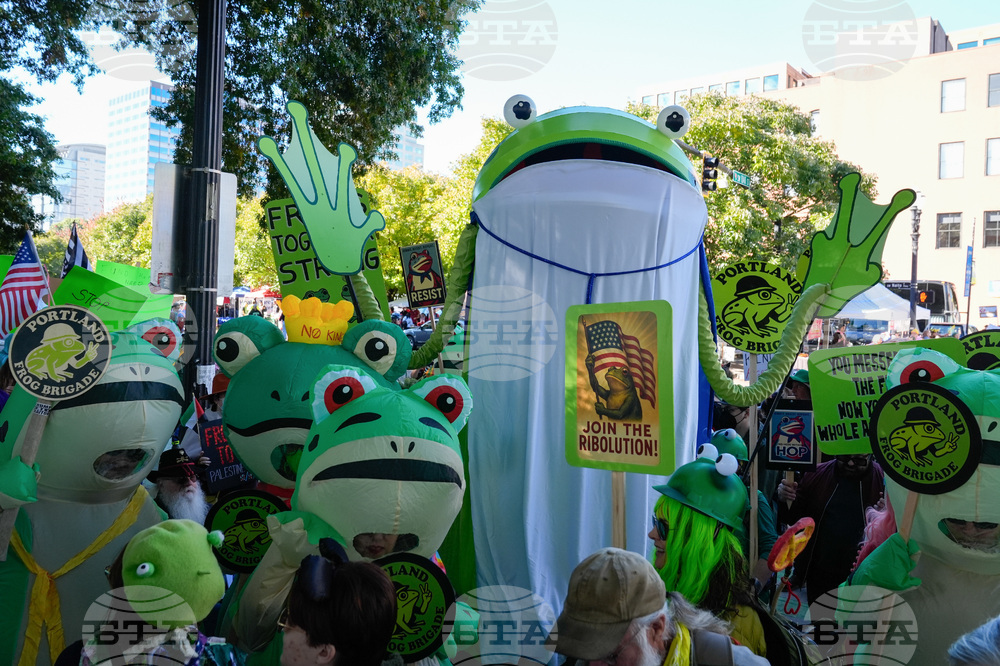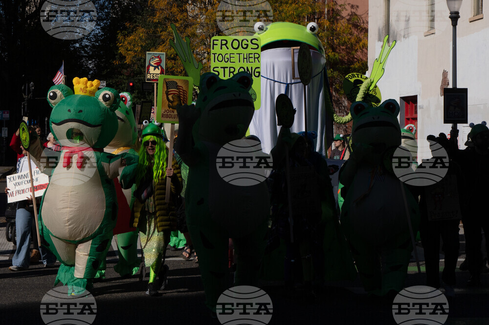People in frog costumes gather for a "No Kings" protest Saturday, Oct. 18, 2025, in Portland, Ore. (AP Photo/Jenny Kane)