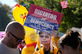 Mary Ann Seeger watches a people gather for a "No Kings" protest Saturday, Oct. 18, 2025, in Portland, Ore. (AP Photo/Jenny Kane)