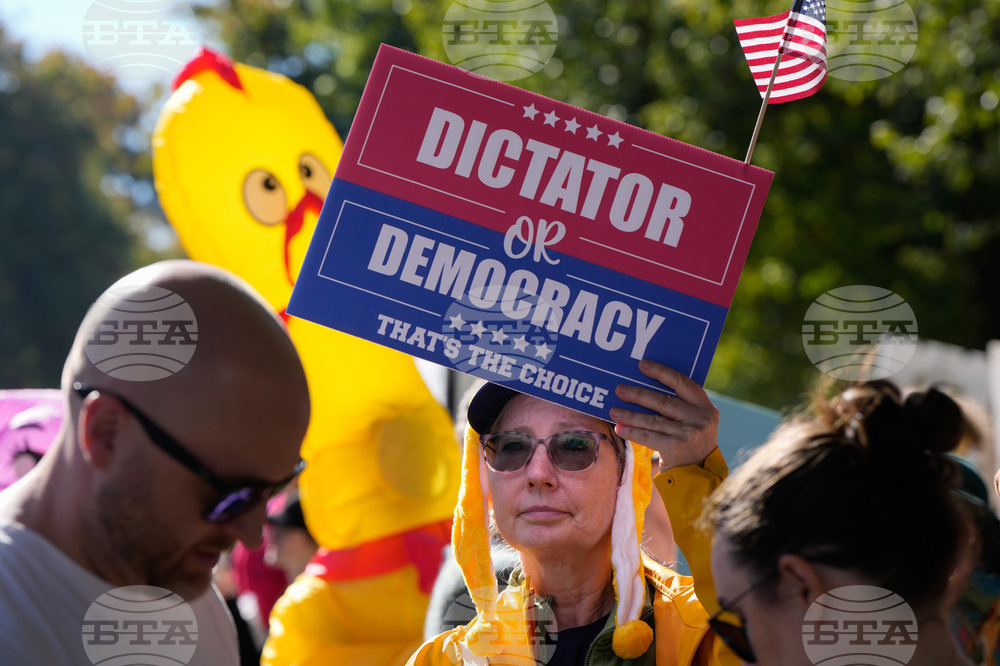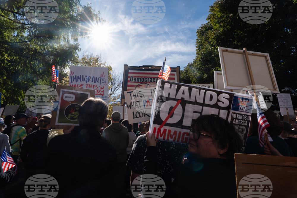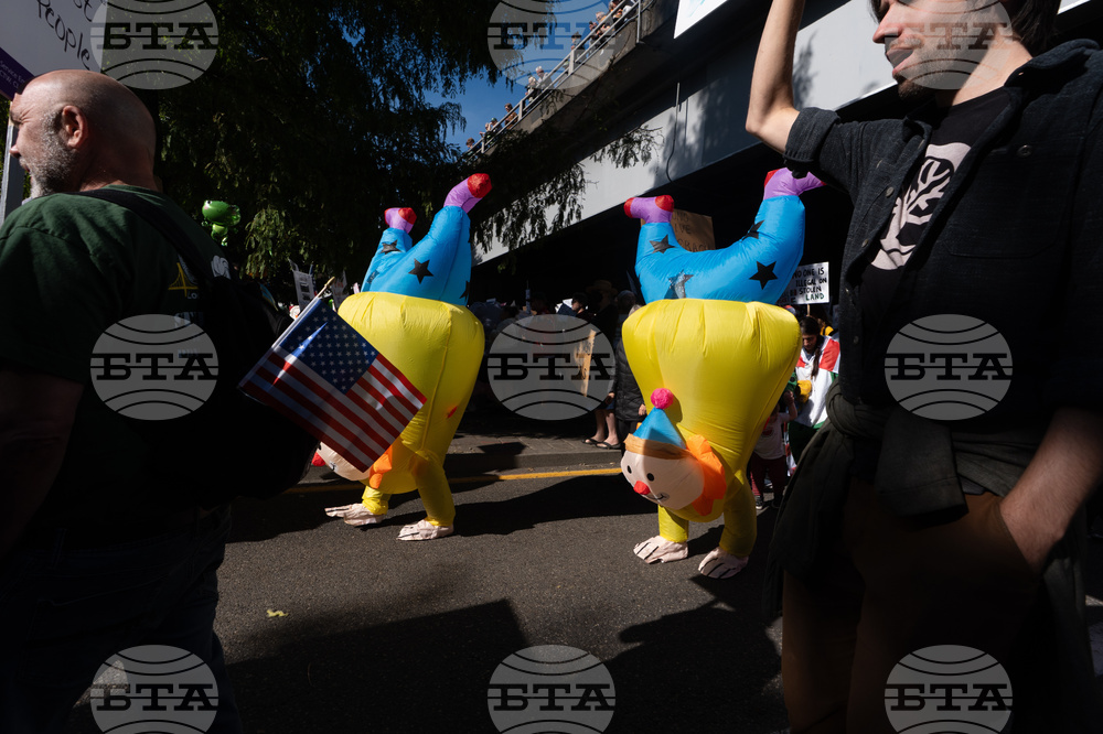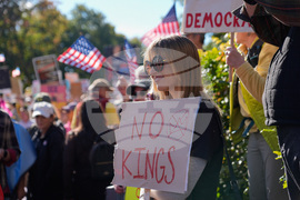 People gather for a "No Kings" protest in Portland, Ore., on Saturday, Oct. 18, 2025. (AP Photo/Jenny Kane)