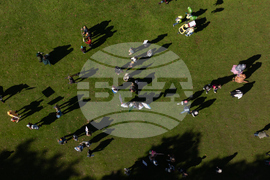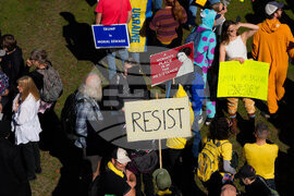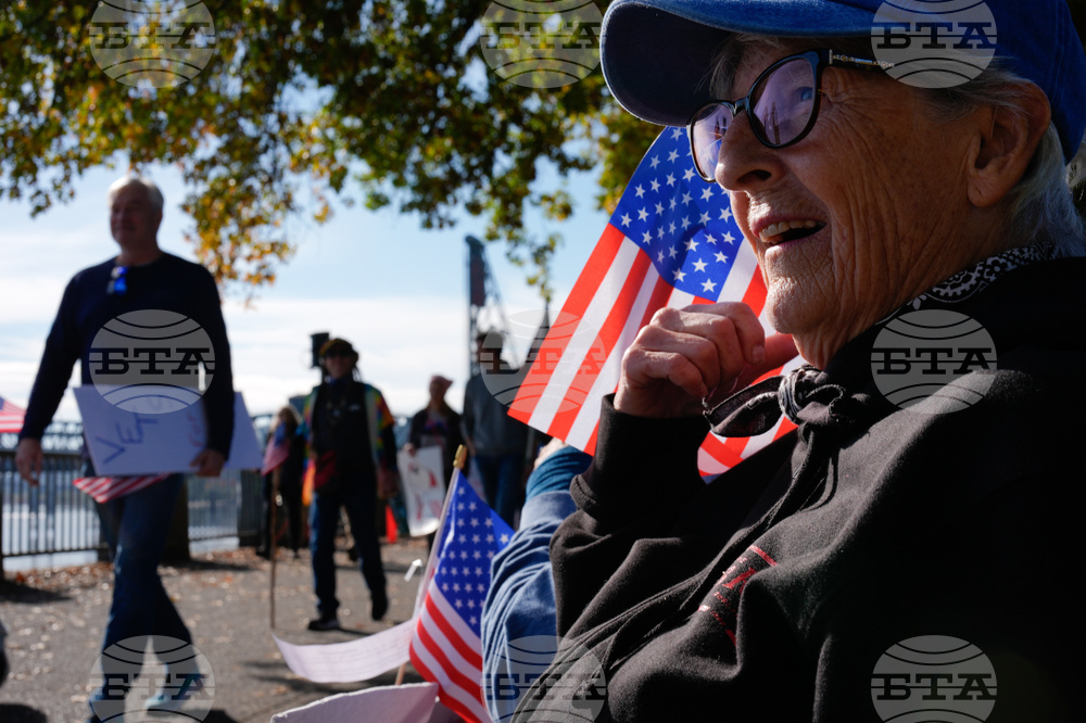 People gather along a waterfront park during a "No Kings" protest in Portland, Ore., on Saturday, Oct. 18, 2025. (AP Photo/Jenny Kane)