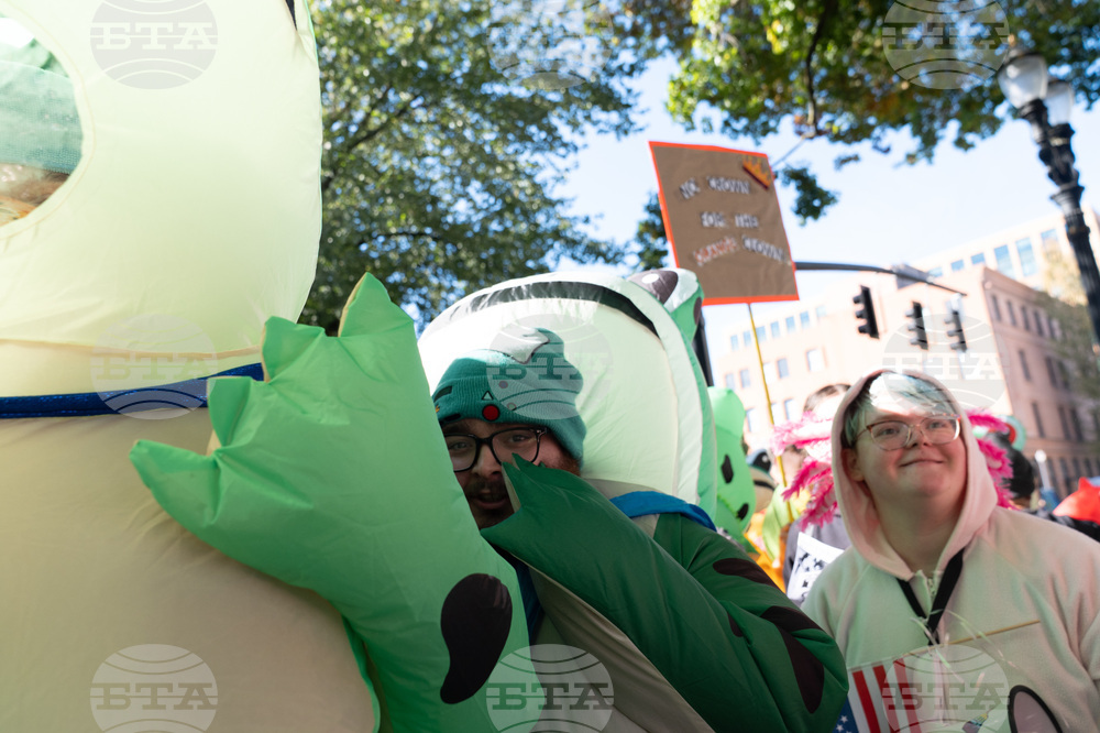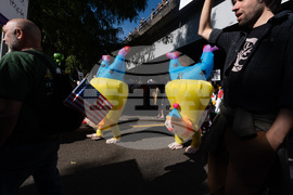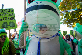 People dressed as frogs arrive for a "No Kings" protest in Portland, Ore., on Saturday, Oct. 18, 2025. (AP Photo/Jenny Kane)