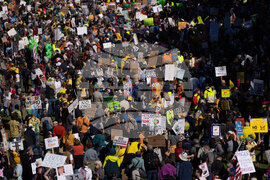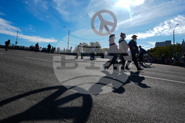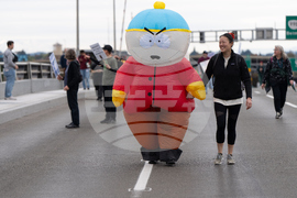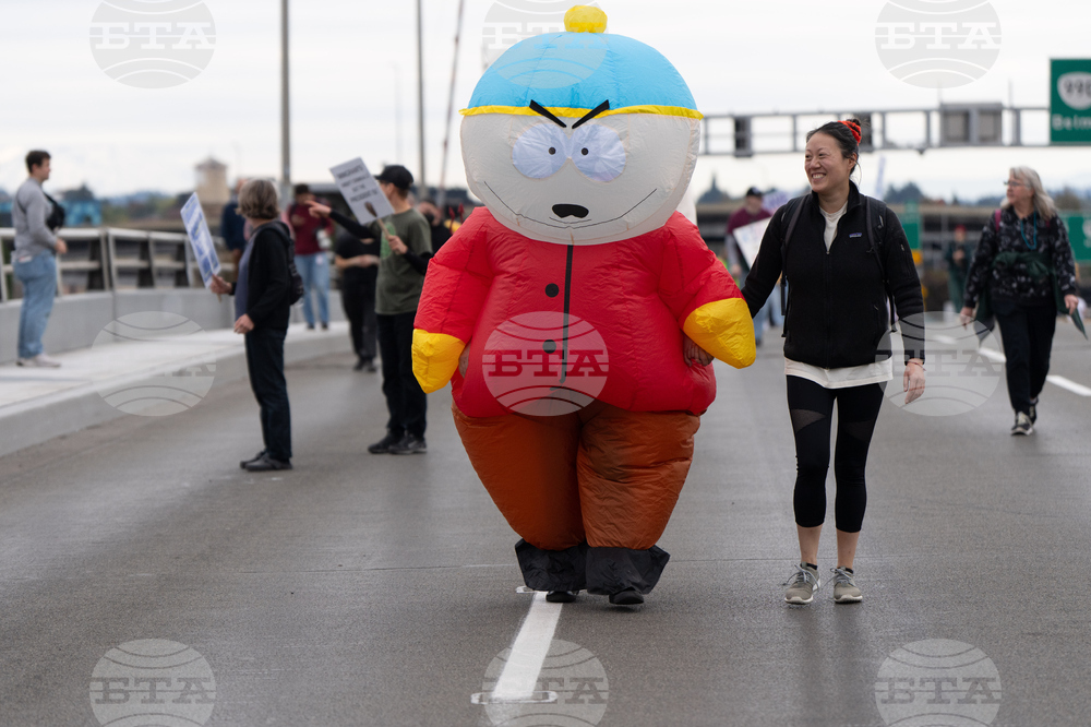 People walk across the Morrison Bridge during a "No Kings" protest Saturday, Oct. 18, 2025, in Portland, Ore. (AP Photo/Jenny Kane)