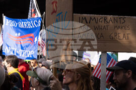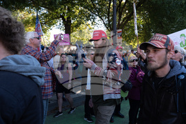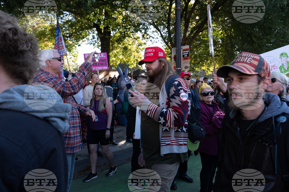 Supporters of President Donald Trump walk by people participating in a "No Kings" protest in Portland, Ore., on Saturday, Oct. 18, 2025. (AP Photo/Jenny Kane)