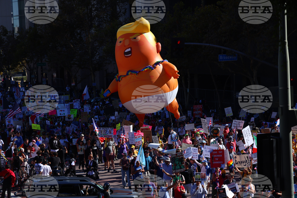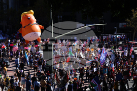 Pulling a giant inflatable Donal Trump protesters march in the streets during a "No Kings" protest Saturday, Oct. 18, 2025, in Los Angeles. (AP Photo/Ethan Swope)