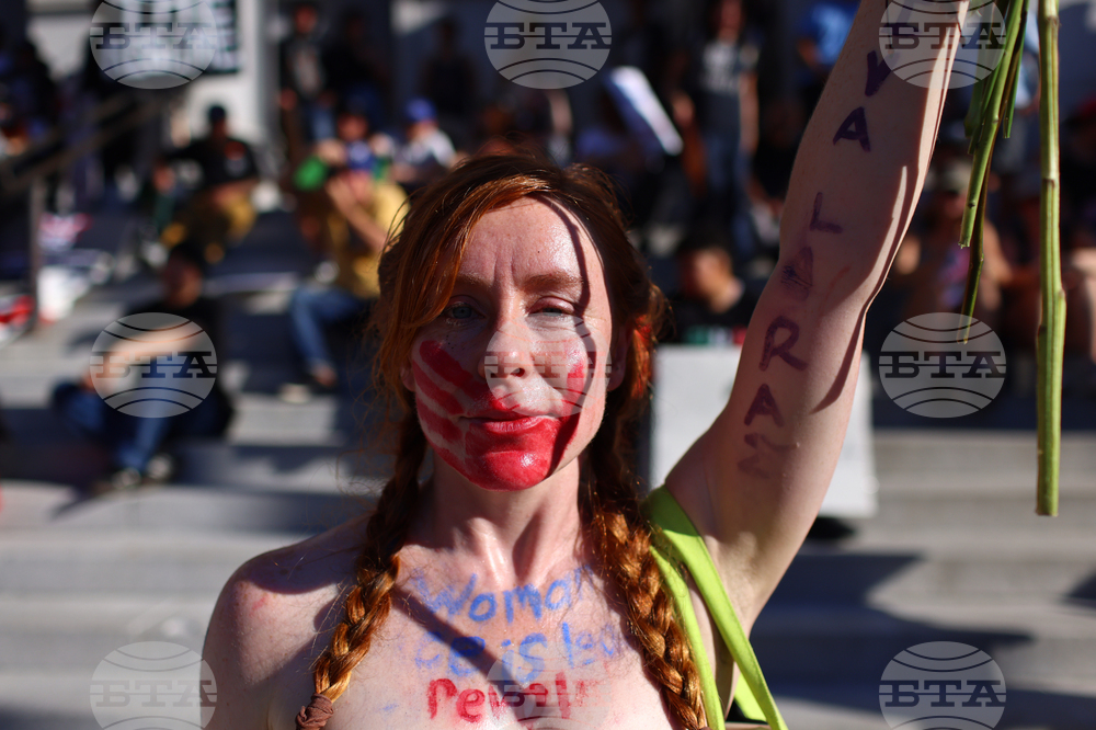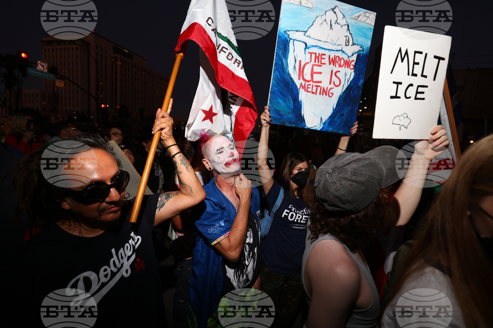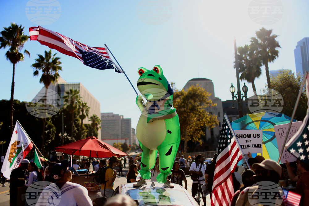 EDS NOTE: OBSCENITY - A protester wearing an inflatable frog costume and waving an American flag takes part in a "No Kings" protest Saturday, Oct. 18, 2025, in Los Angeles. (AP Photo/Ethan Swope)