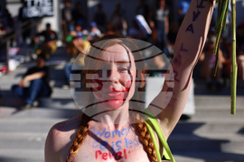 Protesters march in the streets during a "No Kings" protest Saturday, Oct. 18, 2025, in Los Angeles. (AP Photo/Ethan Swope)