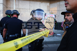 A law enforcement officer closes off a street by the Metropolitan Detention Center in downtown Los Angeles during a "No Kings" protest Saturday, Oct. 18, 2025. (AP Photo/Ethan Swope)