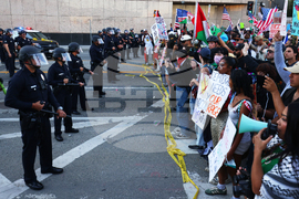 Police officers block a street outside the Metropolitan Detention Center in downtown Los Angeles during a "No Kings" protest Saturday, Oct. 18, 2025. (AP Photo/Ethan Swope)
