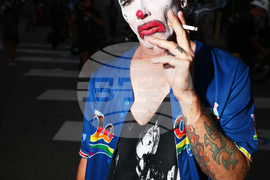 Protester Jake Sullivan, takes a smoke break during, during a "No Kings" protest Saturday, Oct. 18, 2025 in Los Angeles. (AP Photo/Ethan Swope)