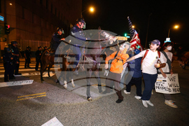 Police on horseback disperse a crowd of protesters, during a "No Kings" protest Saturday, Oct. 18, 2025. (AP Photo/Ethan Swope)
