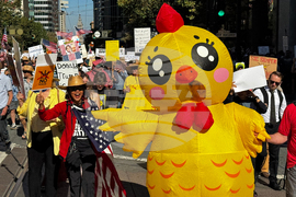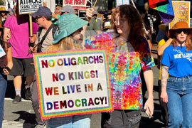 Demonstrators march on Market Street in the second nationwide "No Kings" protest in opposition against the Trump administration in San Francisco, on Saturday, Oct. 18, 2025. (Stephen Lam/San Francisco Chronicle via AP)