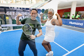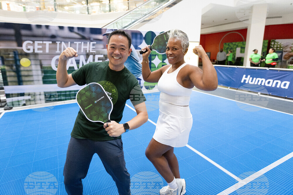 IMAGE DISTRIBUTED FOR HUMANA - Humana's Deputy Chief Medical Officer Dr. Alexander Ding plays pickleball with Health and Wellness Influencer Jalonda Hill during Humana's pickleball pop-up event, which invited the community to "Get in the Game" and stay healthy and active, on Saturday, Oct. 18, 2025 at Woodfield Mall in Schaumburg, Ill. (John Konstantaras/AP Content Services for Humana)