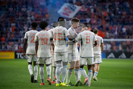 FC Cincinnati defender Nick Hagglund, second from front right, celebrates with teammates after scoring during the first half of an MLS soccer match against CF Montréal, Saturday, Oct. 18, 2025, in Cincinnati. (AP Photo/Tanner Pearson)