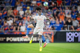 FC Cincinnati forward Kei Kamara (85) heads a ball as CF Montréal defender Fernando Álvarez (obscured) defends during the second half of an MLS soccer match, Saturday, Oct. 18, 2025, in Cincinnati. (AP Photo/Tanner Pearson)