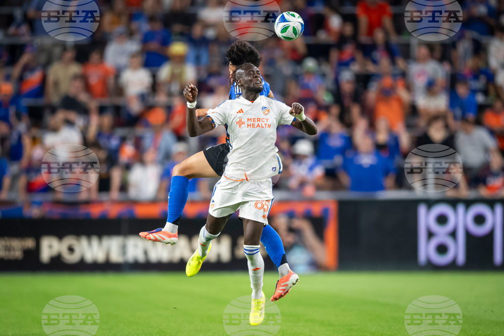 FC Cincinnati forward Kei Kamara (85) heads a ball as CF Montréal defender Fernando Álvarez, behind, defends during the second half of an MLS soccer match, Saturday, Oct. 18, 2025, in Cincinnati. (AP Photo/Tanner Pearson)