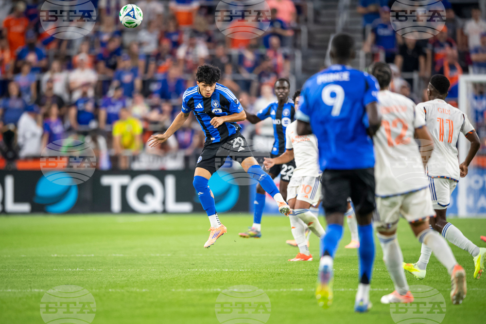 CF Montréal midfielder Olger Escobar (29) heads a ball during the second half of an MLS soccer match against FC Cincinnati, Saturday, Oct. 18, 2025, in Cincinnati. (AP Photo/Tanner Pearson)