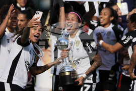 Players of Brazil's Corinthians celebrate with the trophy after defeating Colombia's Deportivo Cali and winning the Women's Copa Libertadores final soccer match in Buenos Aires, Argentina, Saturday, Oct. 18, 2025. (AP Photo/Luciano Gonzalez)
