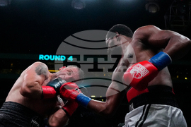 Equatorial Guinea's Andres Martinez, left, punches Avtandil Khurtsidze during the fourth round of a cruiserweight boxing match Saturday, Oct. 18, 2025, at Barclays Center in New York. (AP Photo/Frank Franklin II)