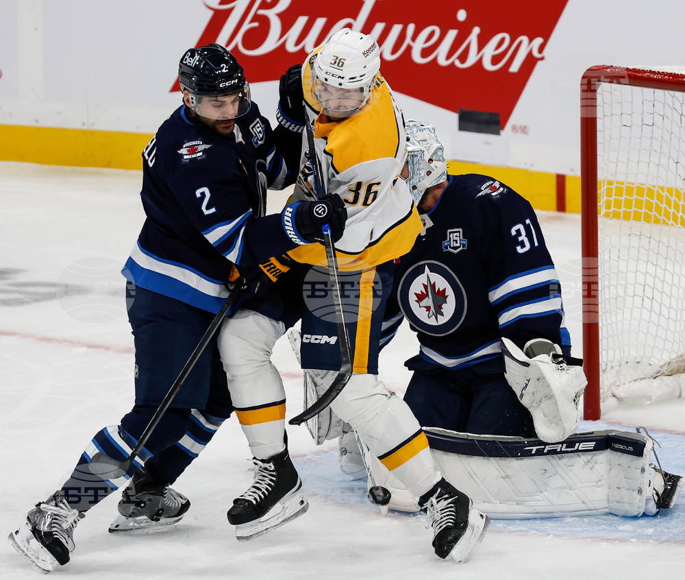 Winnipeg Jets' Dylan DeMelo (2) defends against Nashville Predators' Cole Smith (36) as he attempts to knock in the rebound during the first period of an NHL hockey game in Winnipeg, Manitoba, on Saturday, October 18, 2025. (John Woods/The Canadian Press via AP)