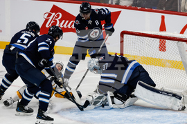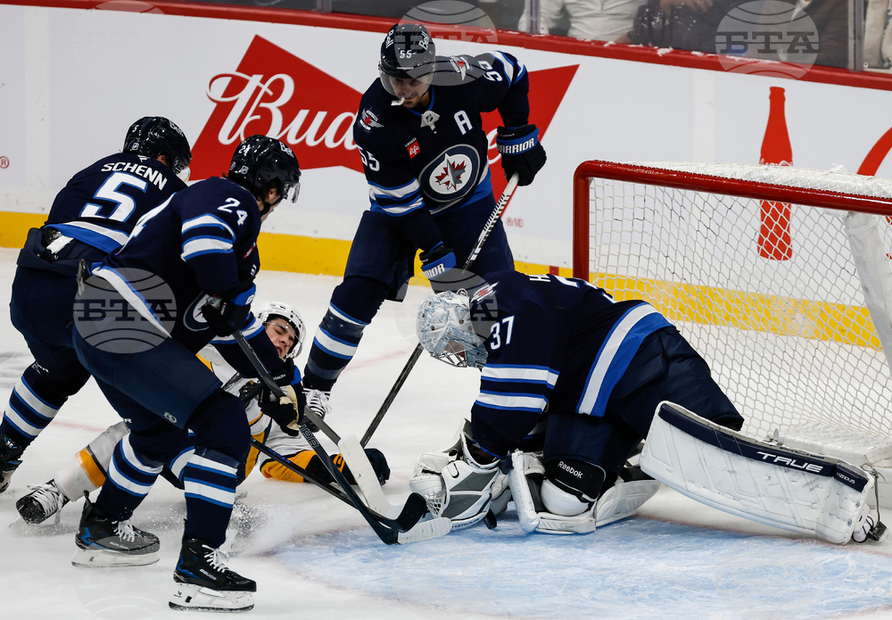 Winnipeg Jets' Josh Morrissey (44) and Nashville Predators' Filip Forsberg (9) collide and knock the net off it's moorings as goaltender Connor Hellebuyck (37) keeps his eye on the puck during third period NHL action in Winnipeg on Saturday, Oct. 18, 2025. (John Woods/The Canadian Press via AP)