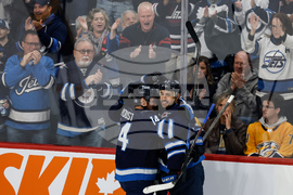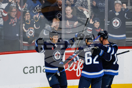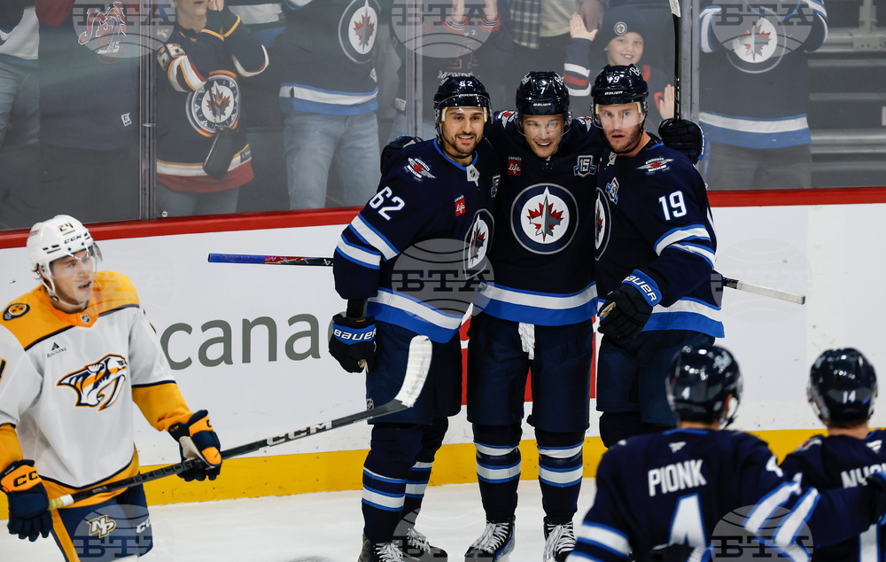 Winnipeg Jets' Nino Niederreiter (62) and Gustav Nyquist (14) celebrate Niederreiter's goal against the Nashville Predators during the first period of an NHL hockey game in Winnipeg, Manitoba, on Saturday, October 18, 2025. (John Woods/The Canadian Press via AP)