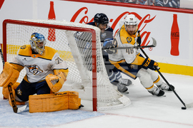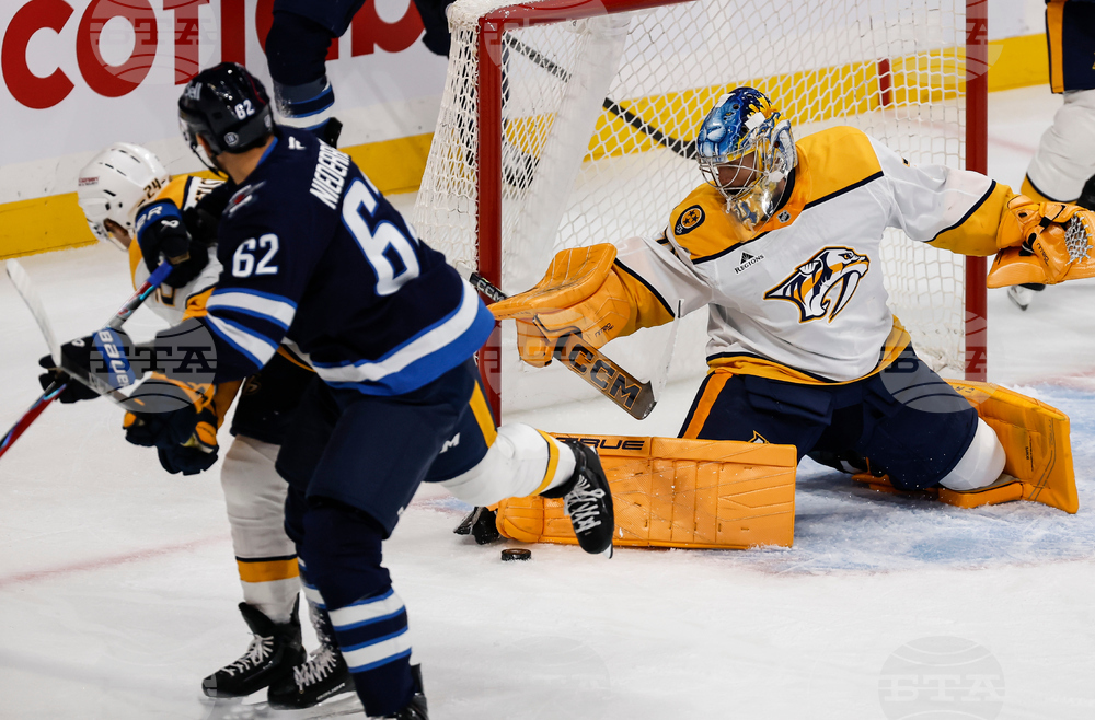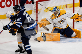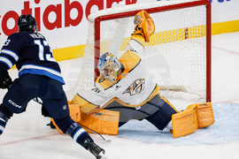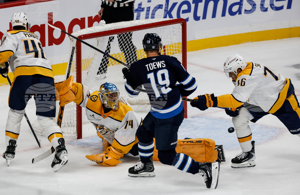 Nashville Predators goaltender Juuse Saros (74) saves the shot from Winnipeg Jets' Nino Niederreiter (62) during the first period of an NHL hockey game in Winnipeg, Manitoba, on Saturday, October 18, 2025. (John Woods/The Canadian Press via AP)