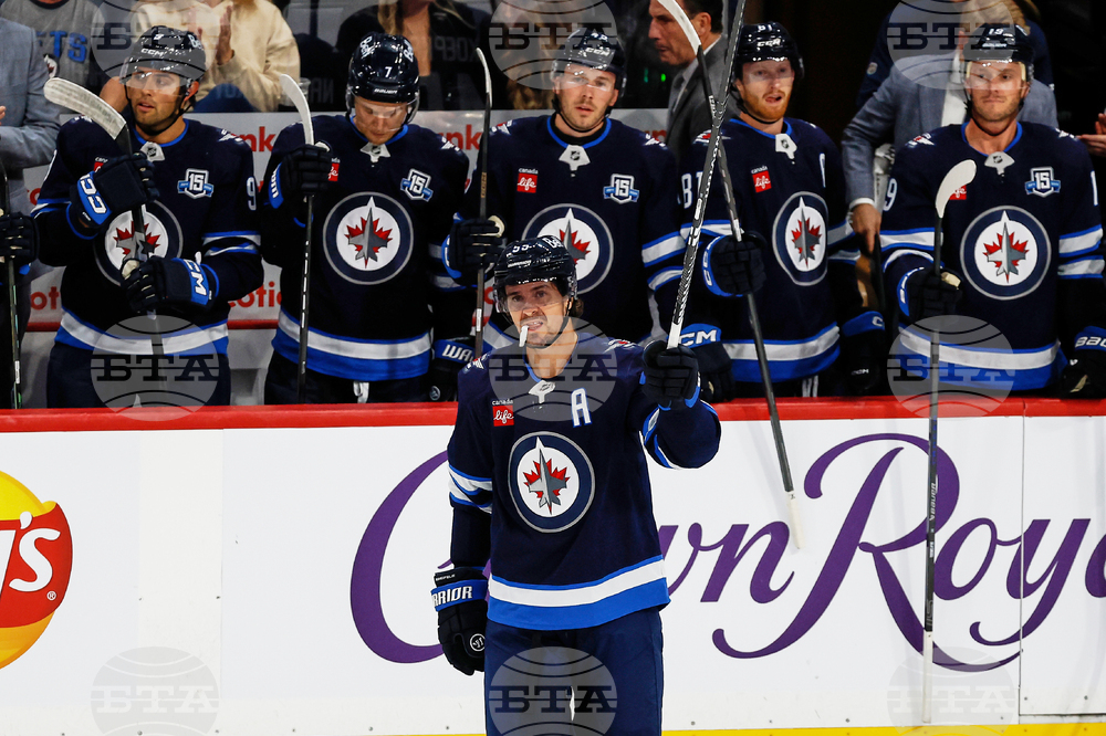 Winnipeg Jets' Mark Scheifele (55) raises his stick to the crowd as he is announced as franchise point leader during the first period of an NHL hockey game in Winnipeg, Manitoba, on Saturday, October 18, 2025. (John Woods/The Canadian Press via AP)