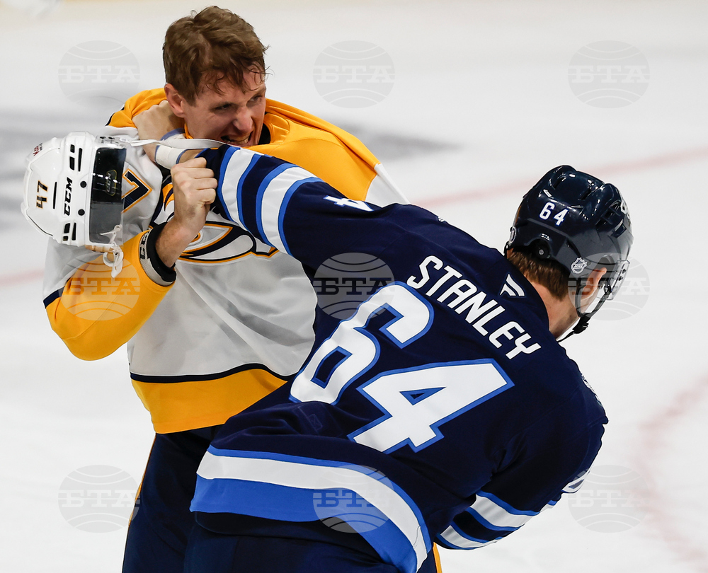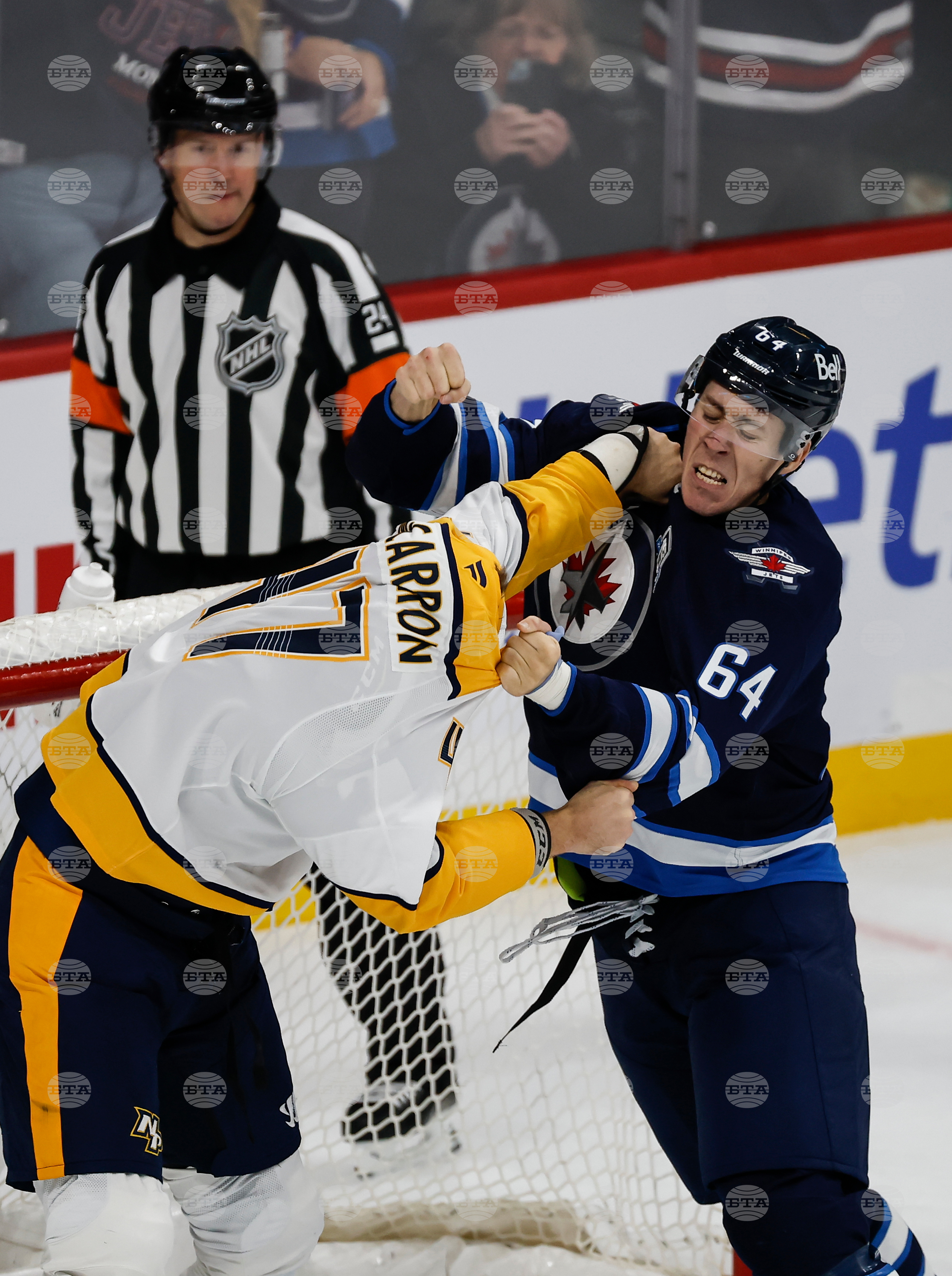 Winnipeg Jets' Logan Stanley (64) and Nashville Predators' Michael McCarron, left, fight during second-period NHL hockey game action in Winnipeg, Manitoba, Saturday, Oct. 18, 2025. (John Woods/The Canadian Press via AP)