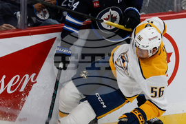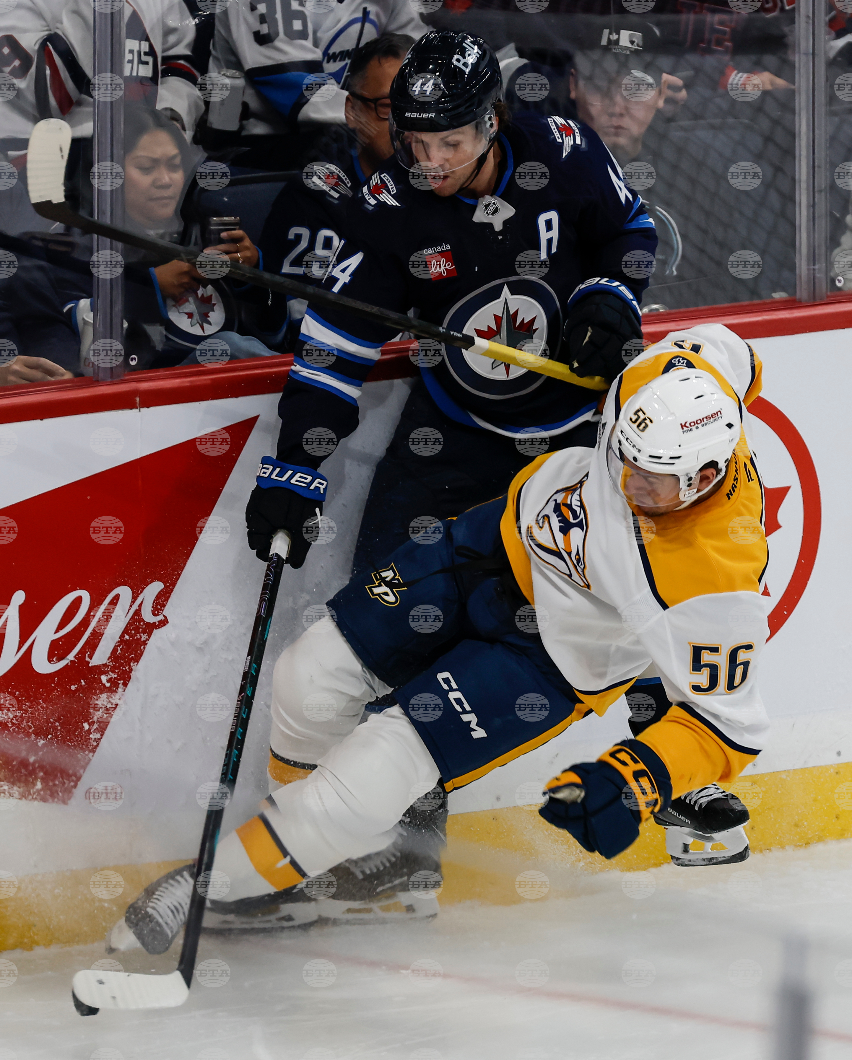 Winnipeg Jets' Josh Morrissey (44) and Nashville Predators' Erik Haula (56) battle for a puck in the corner during second-period NHL hockey game action in Winnipeg, Manitoba, Saturday, Oct. 18, 2025. (John Woods/The Canadian Press via AP)