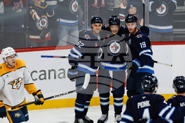 Winnipeg Jets' Vladislav Namestnikov (7), Nino Niederreiter (62) and Jonathan Toews (19) celebrates Namestnikov's goal against the Nashville Predators during third period NHL action in Winnipeg on Saturday, Oct. 18, 2025. (John Woods/The Canadian Press via AP)