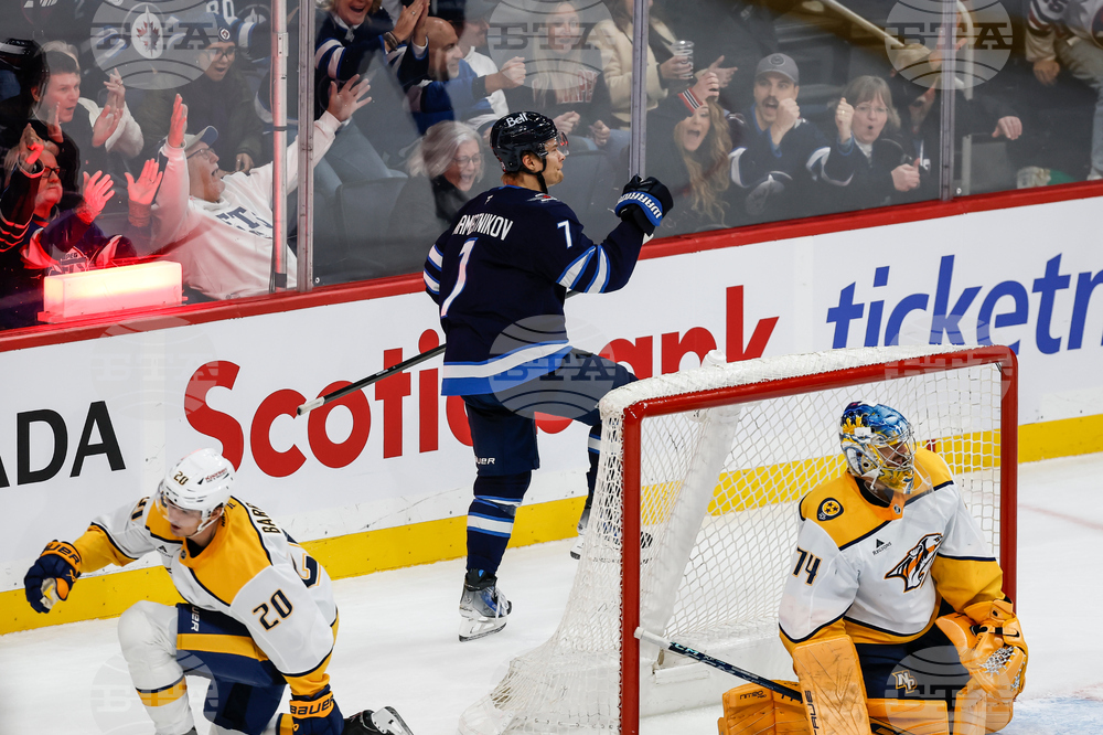 Winnipeg Jets' Vladislav Namestnikov (7) celebrates his goal against Nashville Predators goaltender Juuse Saros (74) during third period NHL action in Winnipeg on Saturday, Oct. 18, 2025. (John Woods/The Canadian Press via AP)