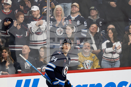 Winnipeg Jets' Logan Stanley (64) looks up at the video screen as he celebrates his goal against the Nashville Predators during the third period of an NHL hockey game in Winnipeg, Manitoba on Saturday, Oct. 18, 2025. (John Woods/The Canadian Press via AP)