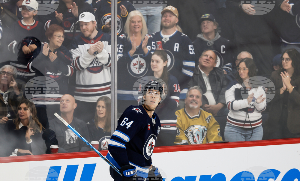 Winnipeg Jets' Nino Niederreiter (62) celebrates his goal against the Nashville Predators during the first period of an NHL hockey game in Winnipeg, Manitoba, on Saturday, October 18, 2025. (John Woods/The Canadian Press via AP)